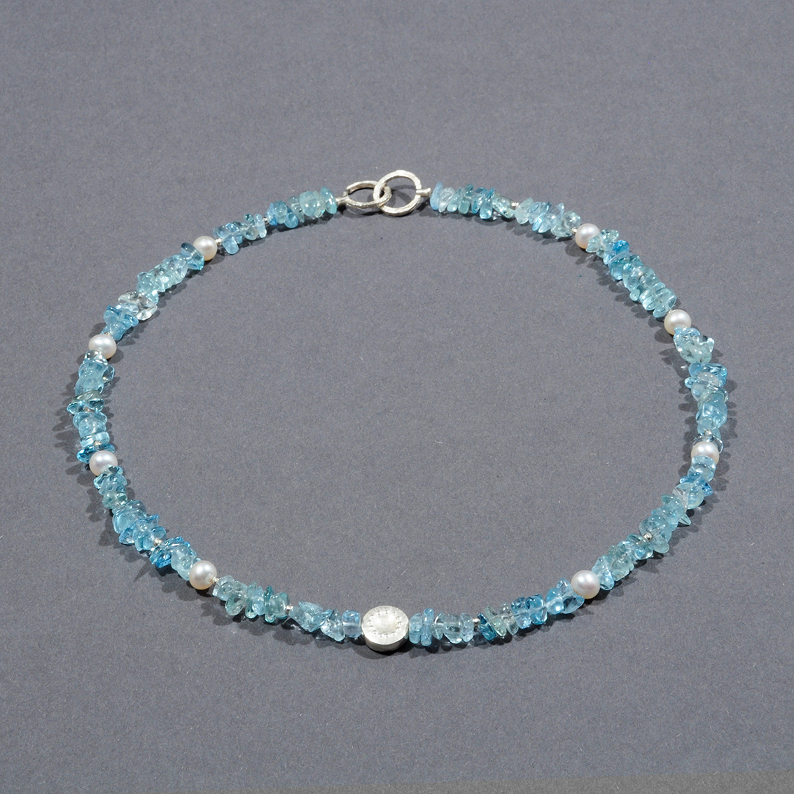 Das Collier wirkt durch die transparentem Aquamarine in sanftem Blau sehr reizvoll, wunderschön ist das Zusammenspiel des zarten Blautons mit den hellen silbernen Akzenten der Zwischenteile und den feinen Süßwasserperlen. Der handgearbeitete Verschluß ist sicher und dennoch einfach in der Handhabung.